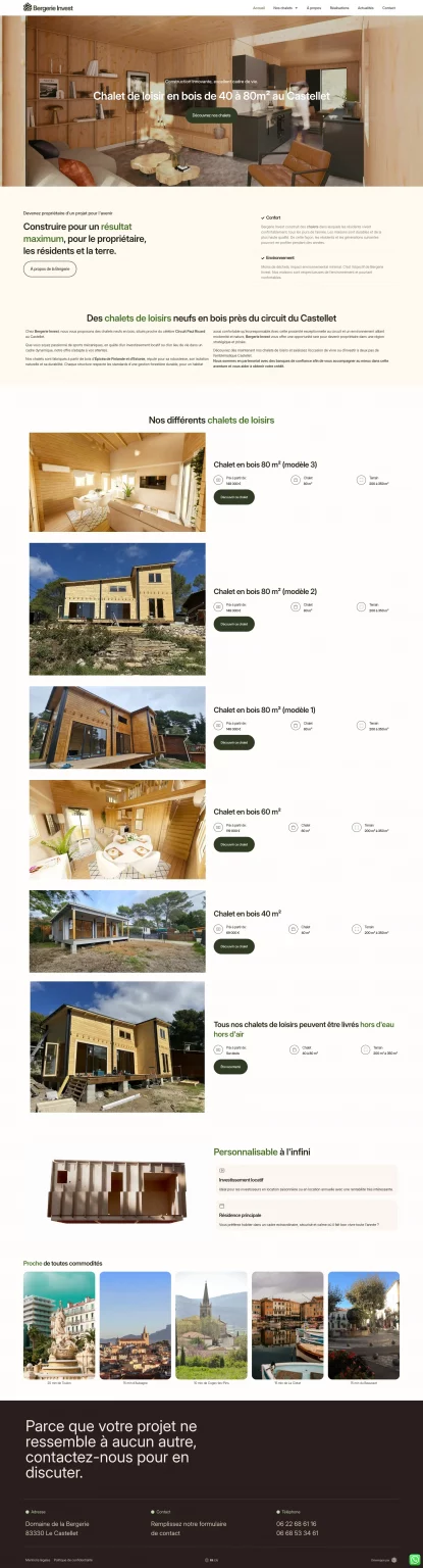 Bergerie Invest est une entreprise spécialisée dans la construction et la vente de chalets en bois de 40 à 80 m², situés près du Circuit Paul Ricard au Castellet. Leurs chalets, fabriqués en épicéa de Finlande et d’Estonie, allient robustesse, isolation naturelle et respect de l’environnement.