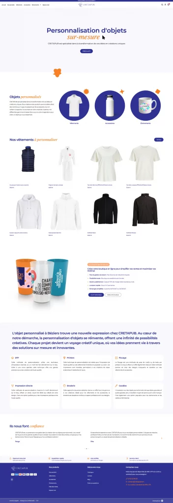 Cretapub, spécialiste de la personnalisation d’objets, nous a confié la refonte de son site web pour moderniser son image et offrir une meilleure expérience utilisateur.